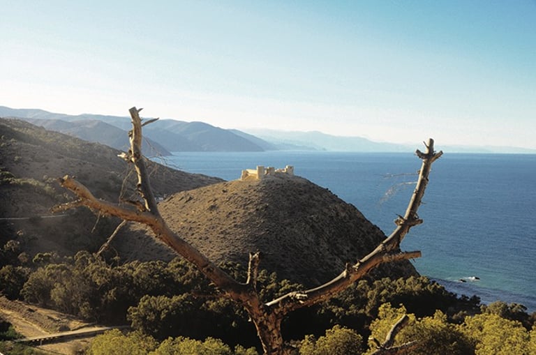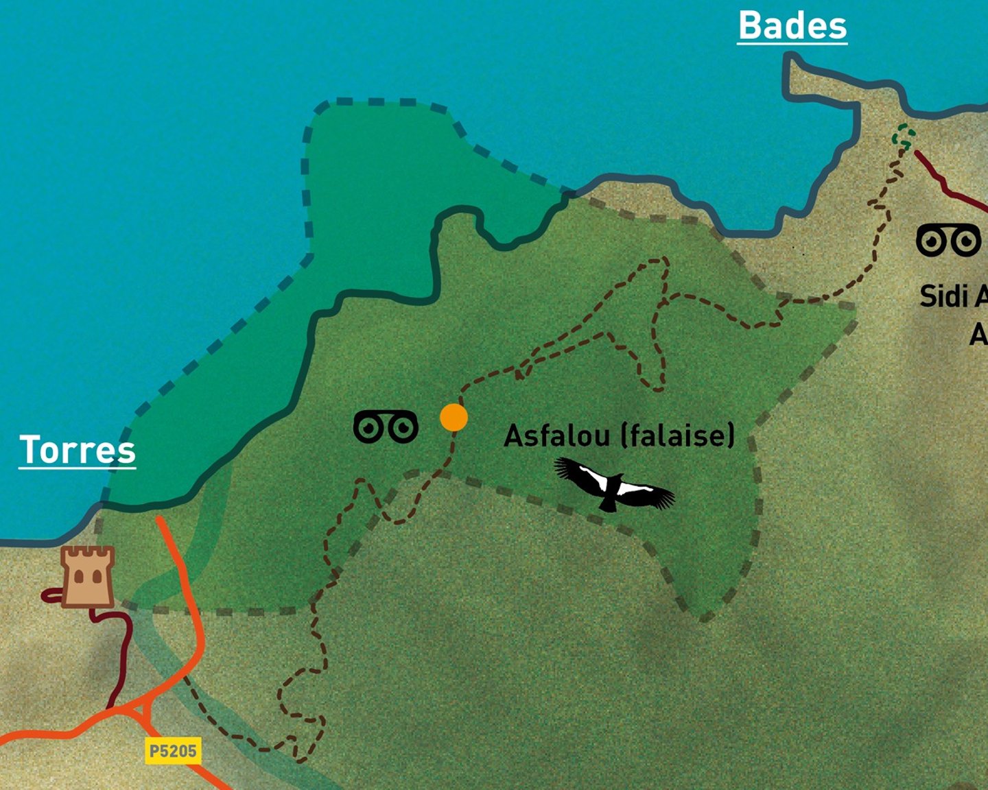 Le parcours débute depuis la plage du village de Torres, petit hameau de pêcheurs bordant une crique de galets. À 1,6 km du départ, la forteresse de Torres Al Kalaa mérite un détour : perchée sur une colline dominant le rivage, ses cinq tours massives en pisé de terre, construites selon les méthodes almohades et mérinides, témoignent d’une architecture militaire séculaire et offrent un panorama exceptionnel sur la côte.