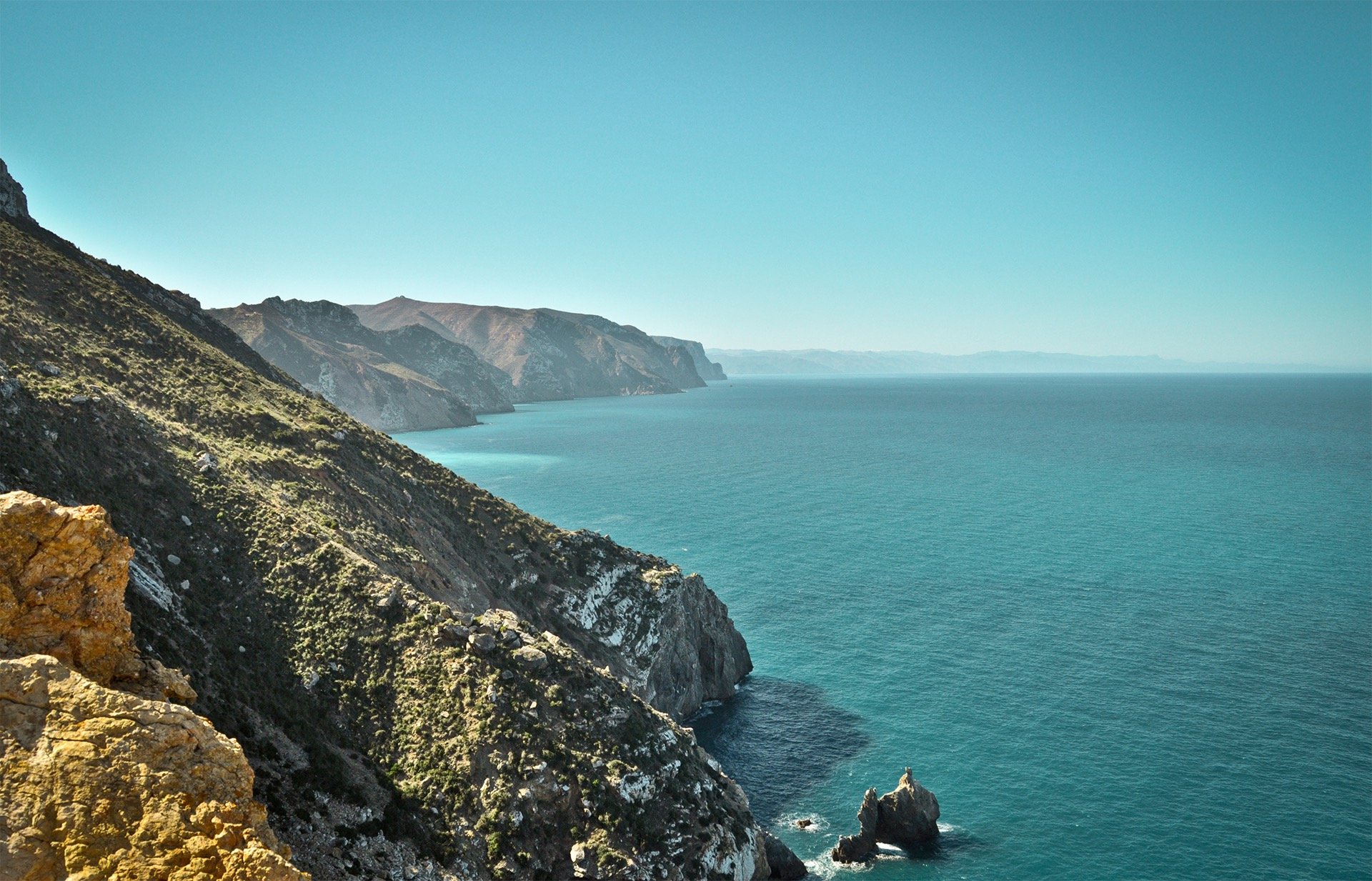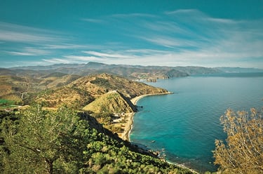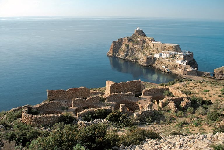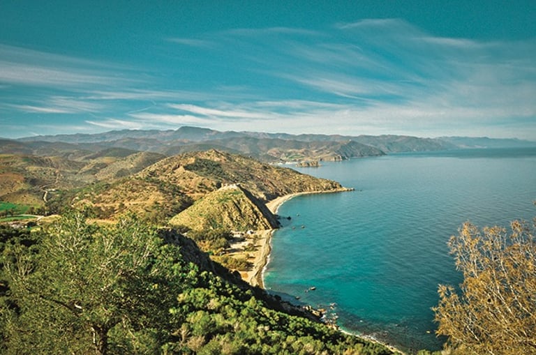 Le sentier épouse ensuite les falaises calcaires surplombant la Méditerranée, offrant des vues vertigineuses sur le Peñón de Vélez de la Gomera, l’îlot espagnol face à la côte. La végétation alterne entre matorral côtier (lentisques, palmiers nains, genêts) sur les hauteurs exposées au vent marin et cultures en terrasses (amandiers, figuiers) dans les vallons abrités. Les senteurs de thym et de lavande accompagnent la progression sur ce terrain rocailleux et parfois escarpé.